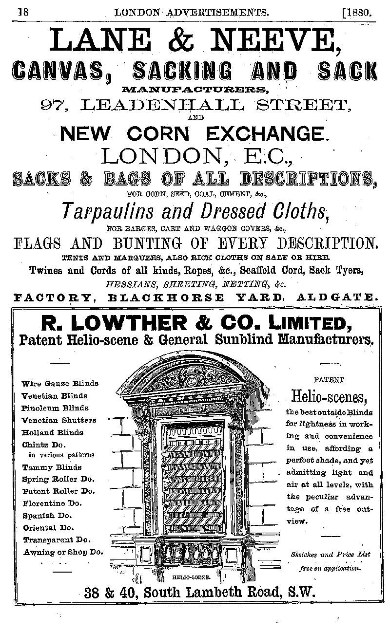 Page 18 Advertisements for Lane & Neave (canvas, sacking and sacks), and R, Lowther & Co. Ltd. (patent Helio-scene and general sunblind manufacturers).
