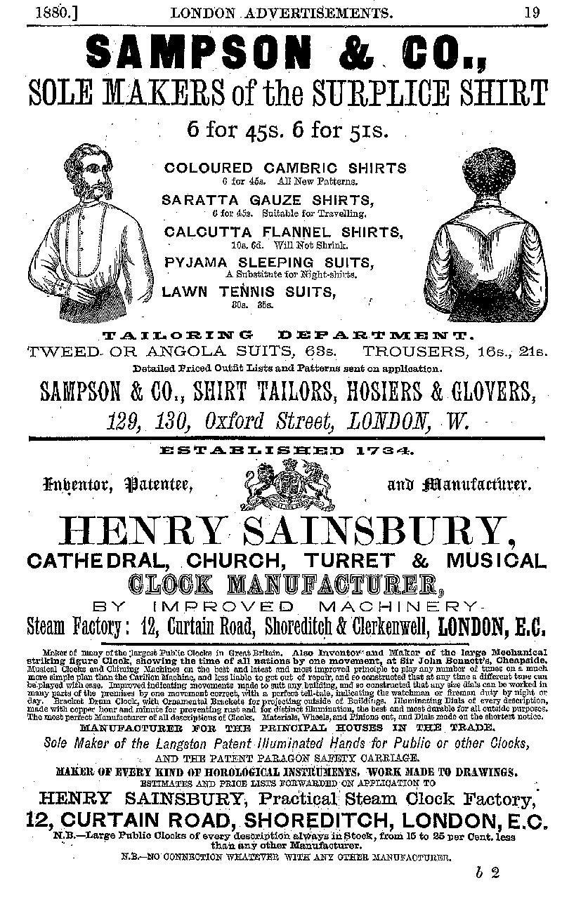 Page 19 Advertisements for Sampson & Co. (surplice shirts), and Henry Sainsbury (cathedral, church, turret and musical clocks).