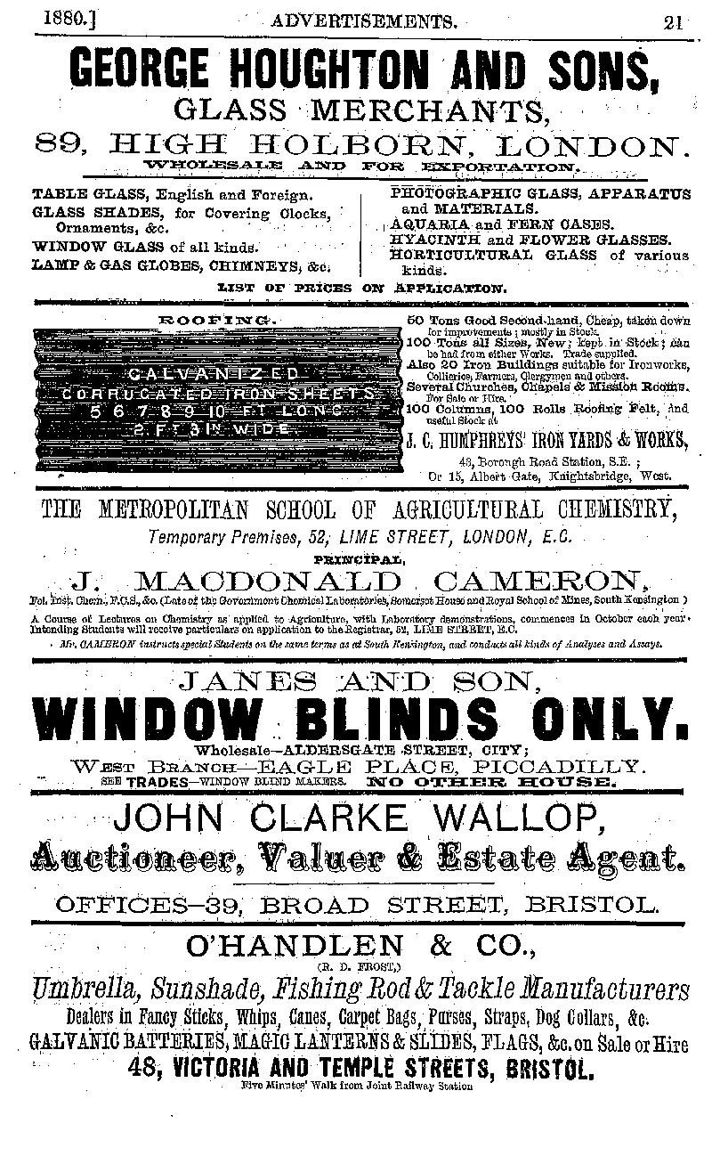 Page 21 Advertisements for George Houghton and Sons (glass merchants), the Metropolitan School of Agricultural Chemistry, Janes and Sons (window blinds), John Clarke Wallop (auctioneer), and O'Handlen & Co.