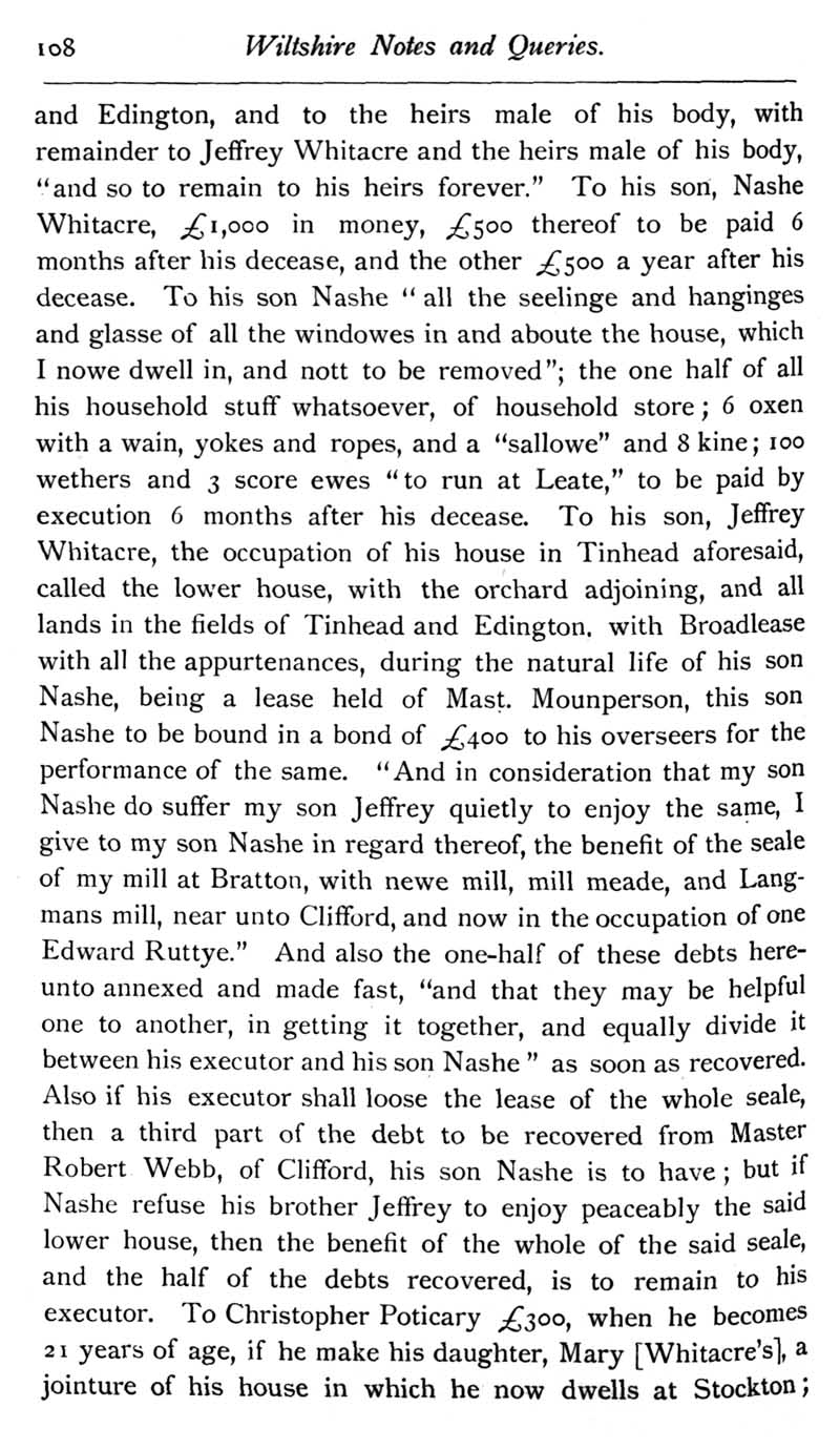 Chapter 4 Paul Bush, Last Rector of Edington ,Records of Wiltshire Parishes,Quakersim in Wiltshire,The Freedom of Sarum,Feet of Fines for Wiltshire,Family Names,Amesbury Monastery,Wiltshire Quakers in America,Queries and Replies