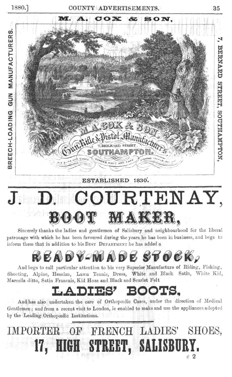 Page 35 Advertisements for M.A.Cox & Son, Southampton (gunsmiths), and J.D. Courtenay, Salisbury (boot maker).