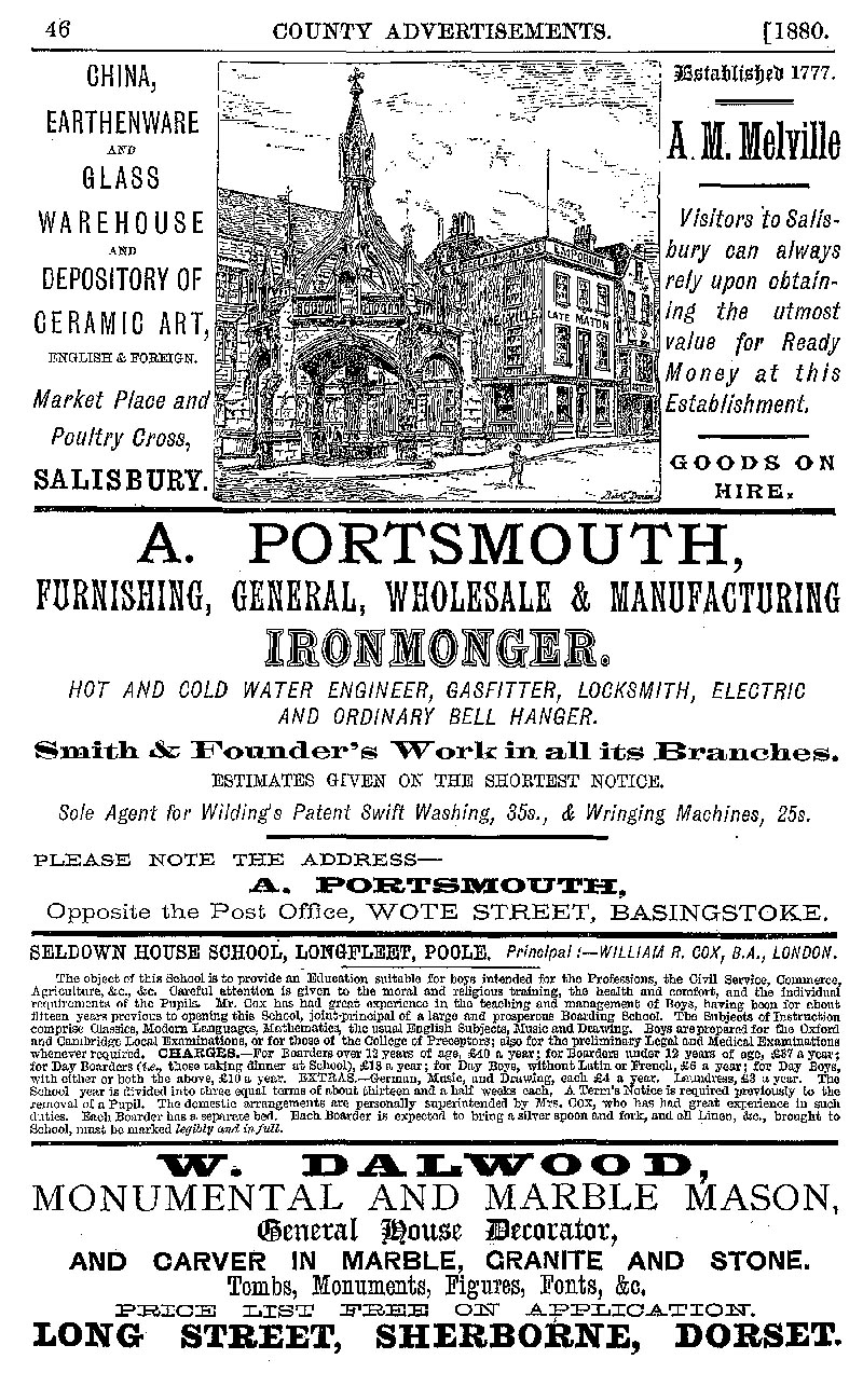 Page 46 Advertisements for A.M. Melville, Salisbury (china and glass). A. Portsmouth, Basingstoke (ironmonger), Seldon House School, Longfleet, Poole, and W. Dalwood, Sherborne (monumental and marble mason).