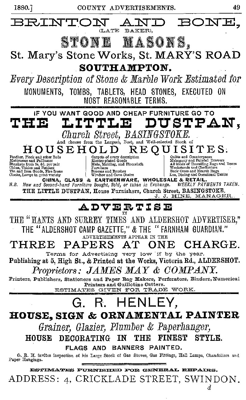 Page 49 Advertisements for Brinton and Bone, Southampton (stone masons), The Little Dustpan, Basingstoke, G.R. Henley, Swindon, (house decorator).