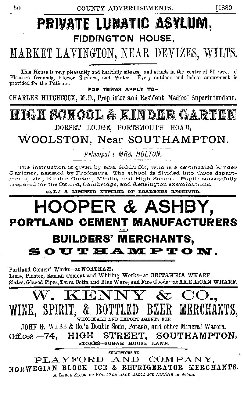 Page 50 Advertisements for the Private Lunatic Asylum, Fiddington House, High School and Kindergarten, Southampton, Hooper & Ashby, Southampton, and W. Kenny & Co. Southampton.
