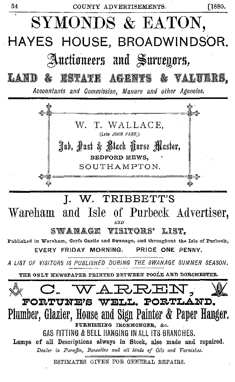 Page 54 Advertisements for Symonds & Eaton, Broadwindsor, W.T. Wallace, Southampton, the Wareham and Isle of Purbeck Advertiser, and C. Warren, Portland.