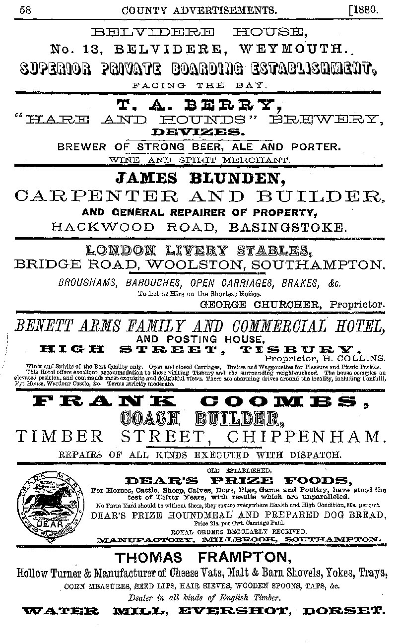 Page 58 Advertisements for T.A. Berry, Hare and Hounds Brewery, Devizes, Benett Arms Family and Commercial Hotel, Tisbury, Frnak Cooper, Chippenham (coach builder) and others.