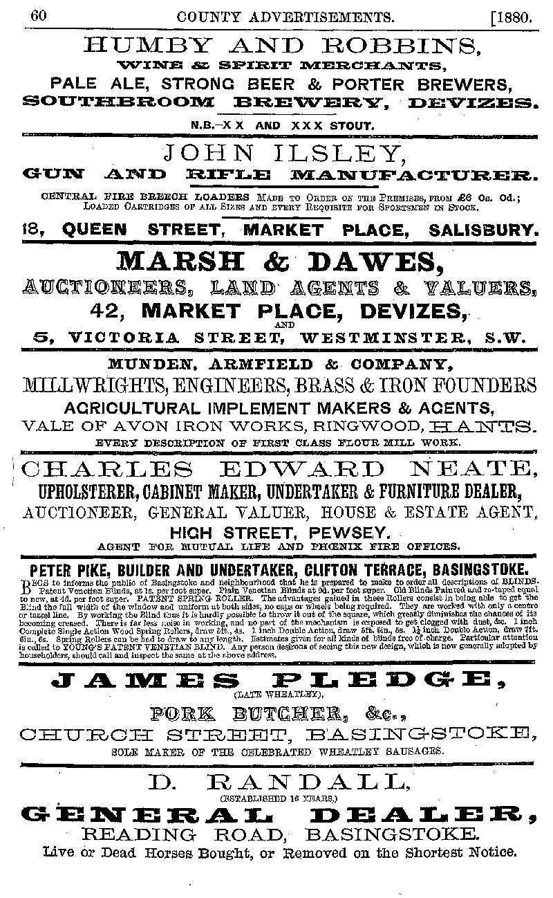 Page 60 Advertisements for Humby and Robbins, Southbroom Brewery, Devizes, John Ilsley, Salisbury (gunsmith), Charles Edward Neate, Pewsey, and others.