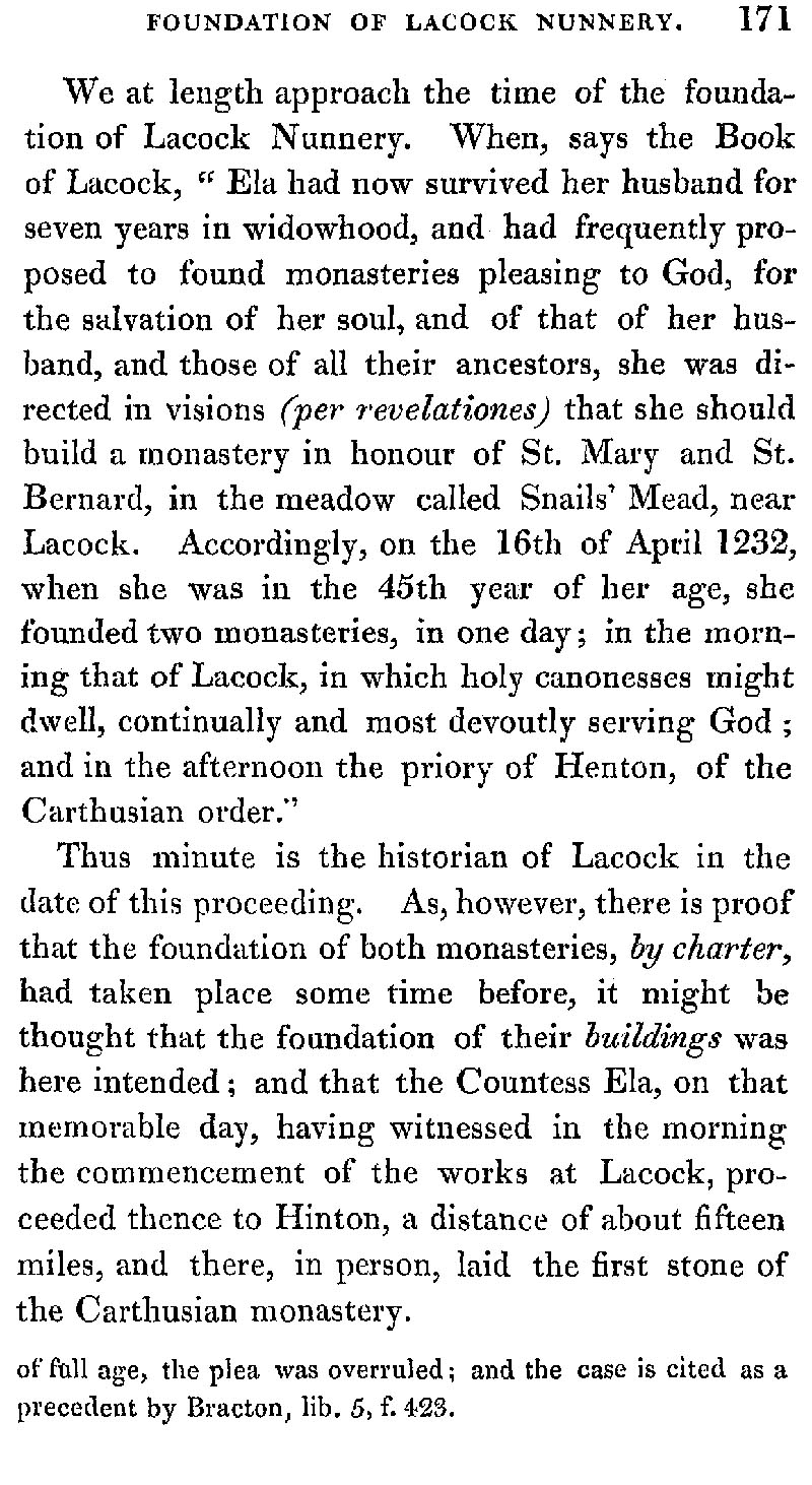 Chapter 8 Ela, Countess of Salisbury; foundation of the Priory of Hinton Charterhouse and the nunnery of Lacock.
