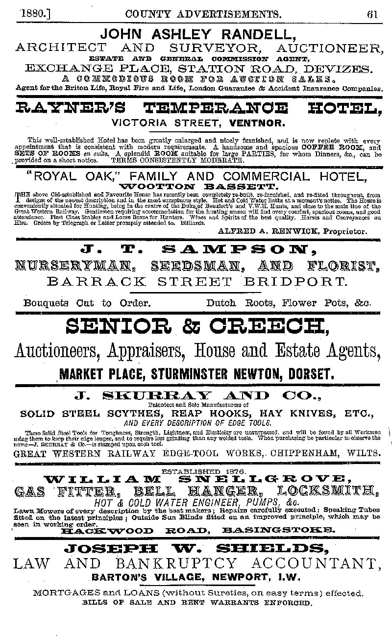 Page 61 Advertisements for John Ashley Randell, Devizes (architect), Royal Oak Family and Commercial Hotel, Wootten Bassett, J. Skurray and Co., Chippenham (edged steel tools), and others.