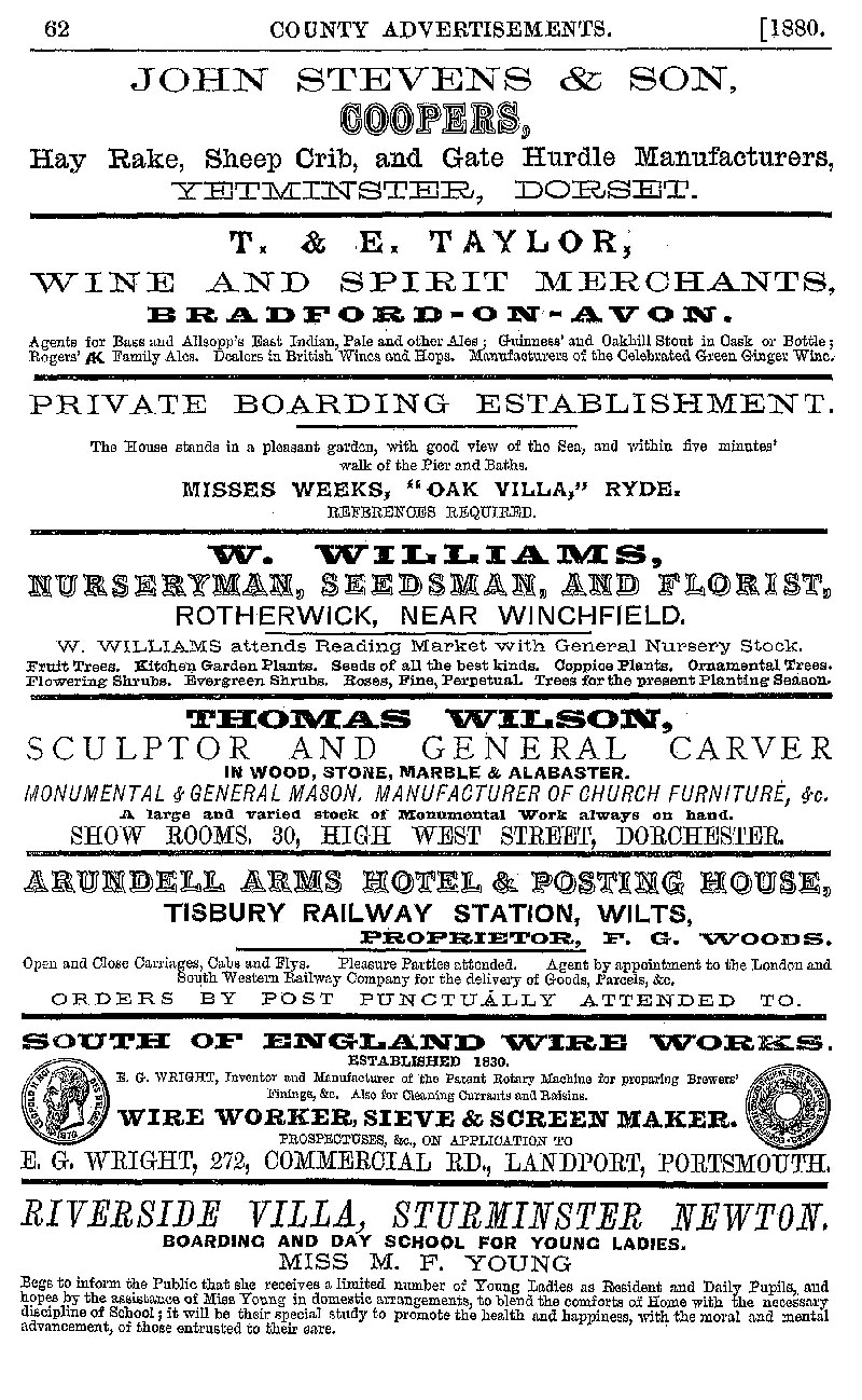 Page 62 Advertisements for T.& E. Taylor & Son, Bradford on Avon (wine and spirit merchants), Arundell Arms Hotel and Posting House, Tisbury, and others.