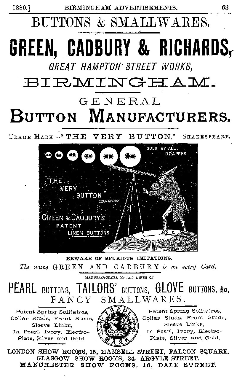 Page 63 Advertisements for Green, Cadbury & Richards (button manufacturers).