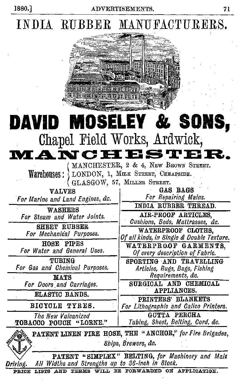 Page 71 Advertisements for David Moseley & Sons, india rubber manufacturers.