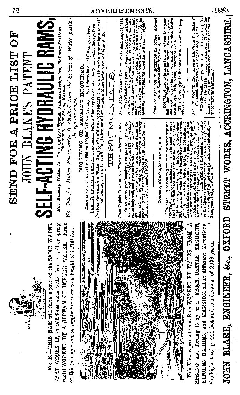 Page 72 Advertisements for John Blake's Patent Self-acting Hydraulic Rams.
