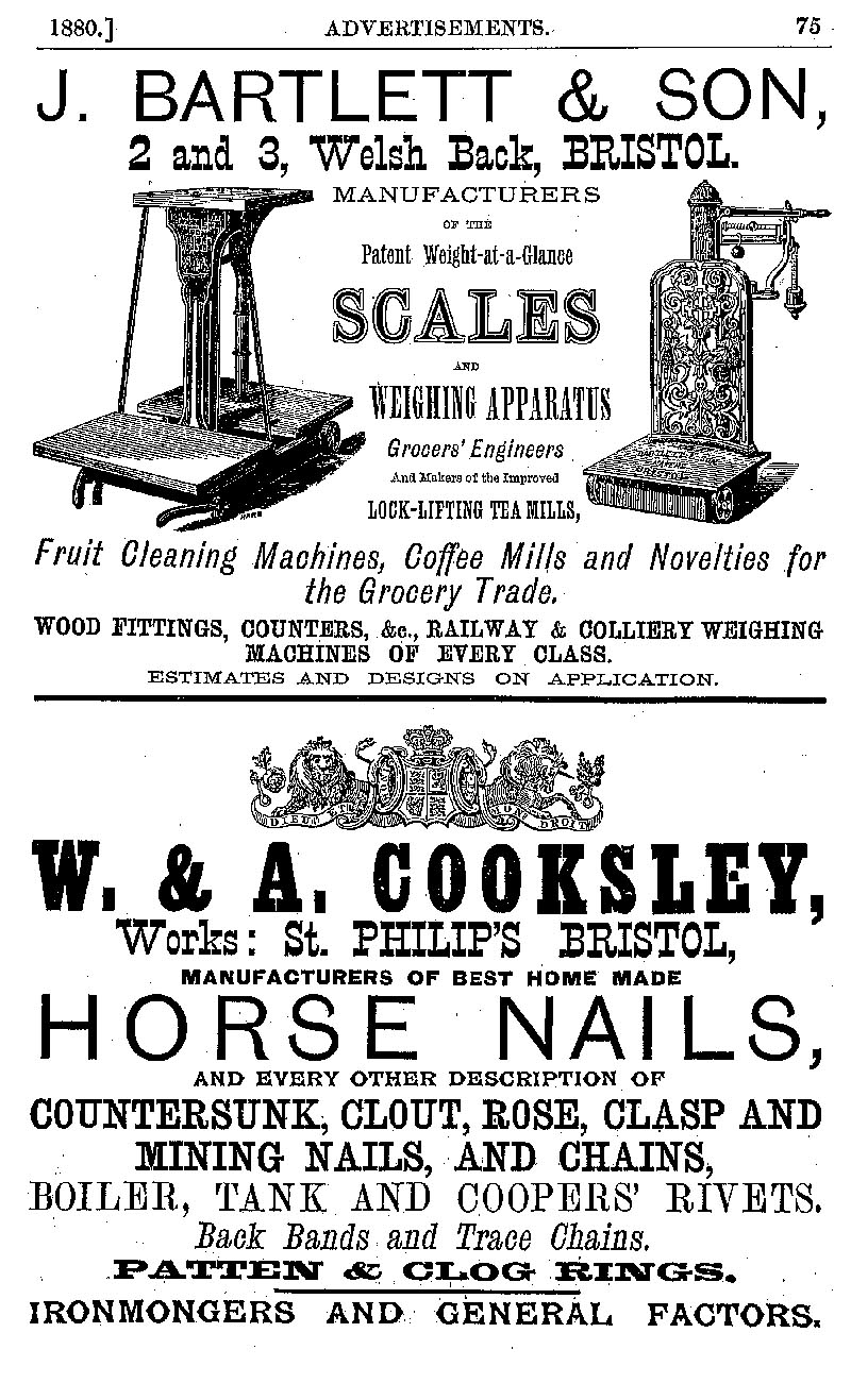 Page 75 Advertisements for J. Bartlett & Son, Bristol, and W. & A. Cooksley, Bristol.
