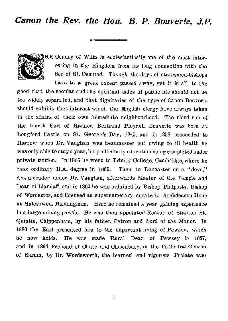 Page 73 Biography of Canon Bertrand Pleydell Bouverie, Rector of Pewsey.