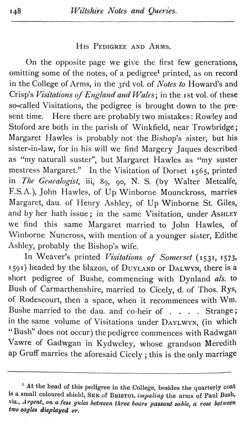 Chapter 5 Paul Bush, last rector of Edington, Bush Family; Feet of Fines for Wiltshire; Quakerism in Wiltshire; Horton Wills; Goddard of Sedgehill; Queries; Replies; Harris, Eyre and Dauntsey; Notes on Books; Review of The Genealogist Magazine.