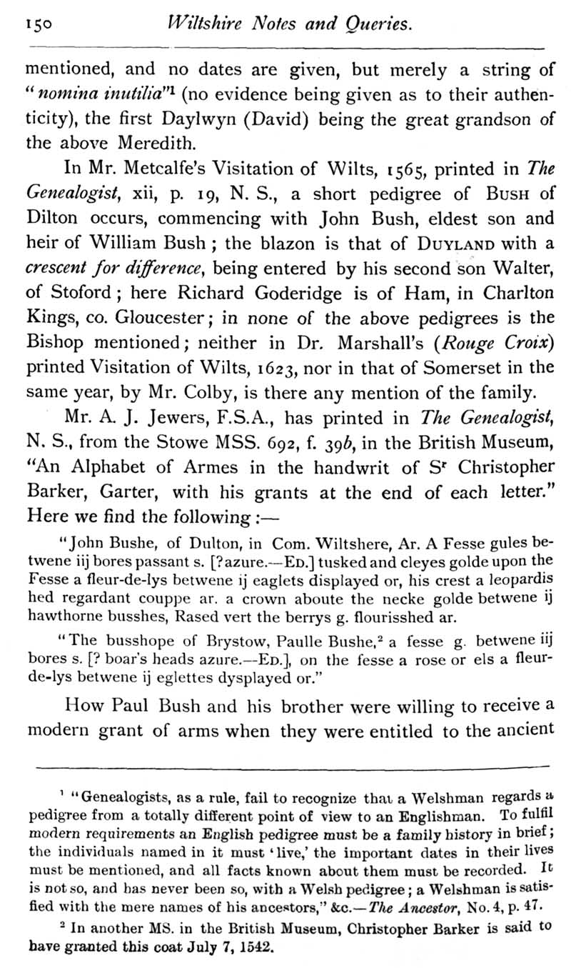 Chapter 5 Paul Bush, last rector of Edington, Bush Family; Feet of Fines for Wiltshire; Quakerism in Wiltshire; Horton Wills; Goddard of Sedgehill; Queries; Replies; Harris, Eyre and Dauntsey; Notes on Books; Review of The Genealogist Magazine.