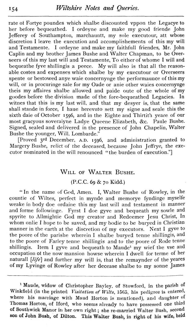 Chapter 5 Paul Bush, last rector of Edington, Bush Family; Feet of Fines for Wiltshire; Quakerism in Wiltshire; Horton Wills; Goddard of Sedgehill; Queries; Replies; Harris, Eyre and Dauntsey; Notes on Books; Review of The Genealogist Magazine.