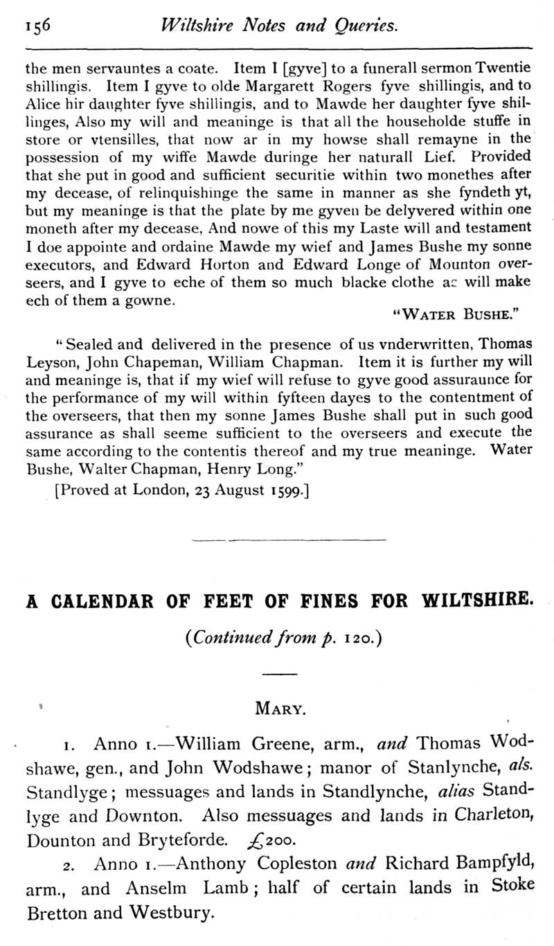 Chapter 5 Paul Bush, last rector of Edington, Bush Family; Feet of Fines for Wiltshire; Quakerism in Wiltshire; Horton Wills; Goddard of Sedgehill; Queries; Replies; Harris, Eyre and Dauntsey; Notes on Books; Review of The Genealogist Magazine.