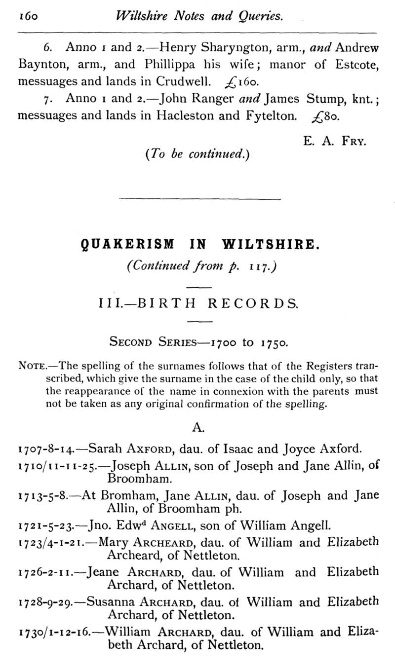Chapter 5 Paul Bush, last rector of Edington, Bush Family; Feet of Fines for Wiltshire; Quakerism in Wiltshire; Horton Wills; Goddard of Sedgehill; Queries; Replies; Harris, Eyre and Dauntsey; Notes on Books; Review of The Genealogist Magazine.