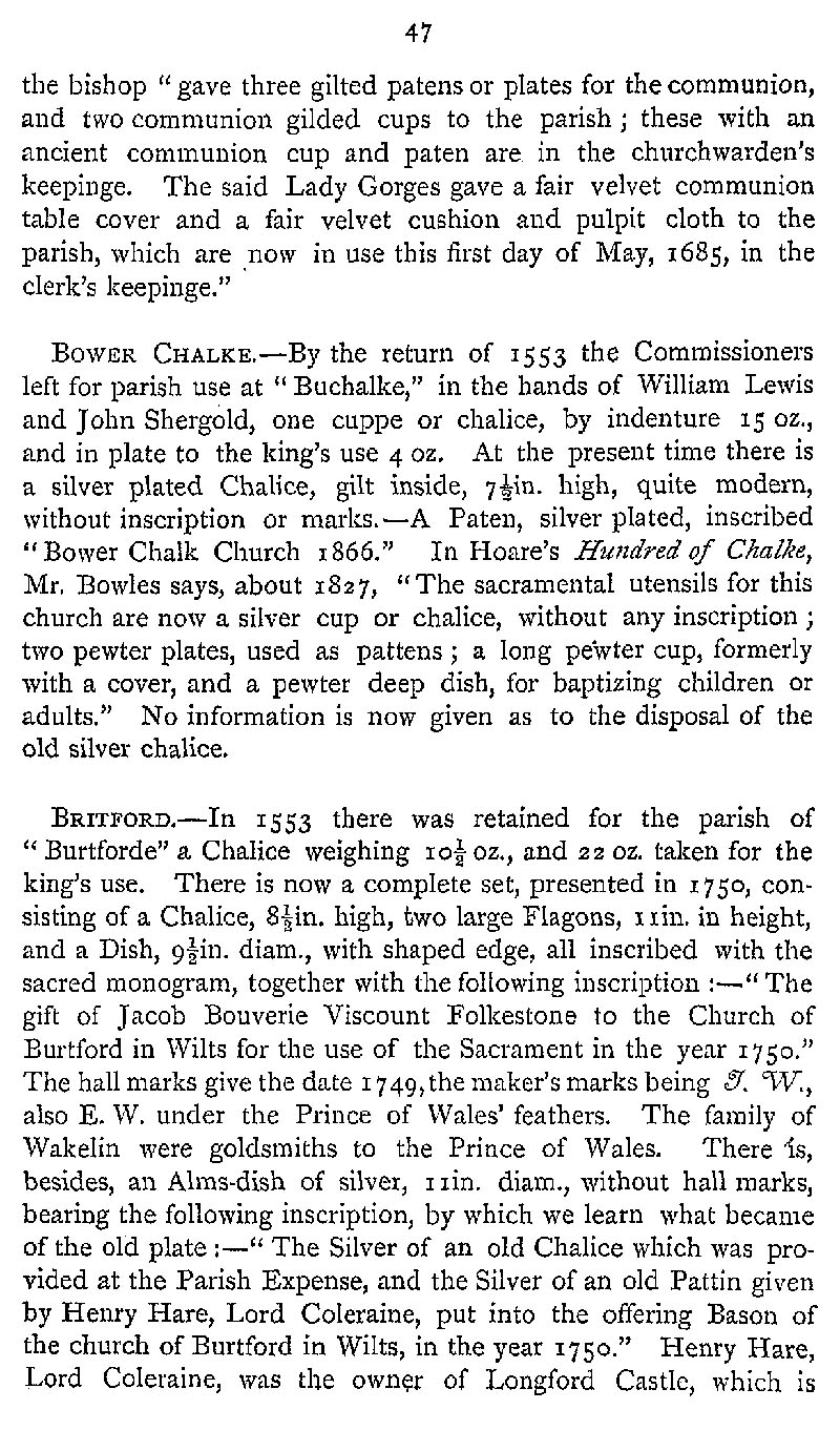Page 73 Church plate in Bishopstone (south Wiltshire) Church, Bower Chalke Church, and Britford Church.