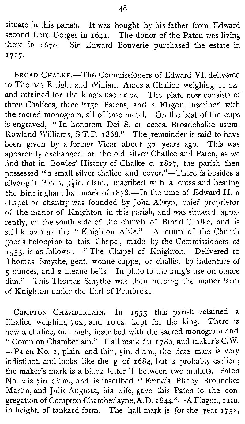 Page 74 Church plate in Britford Church, Broad Chalke Church, and Compton Chamberlayne Church.