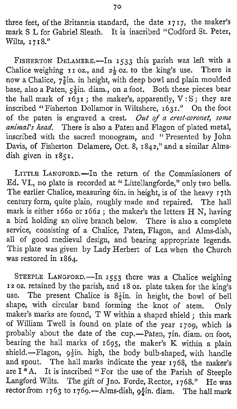 Page 100 Church Plate in Codford St. Peter Church, Fisherton Delamere Church, Little Langford Church and Steeple Langford Church.