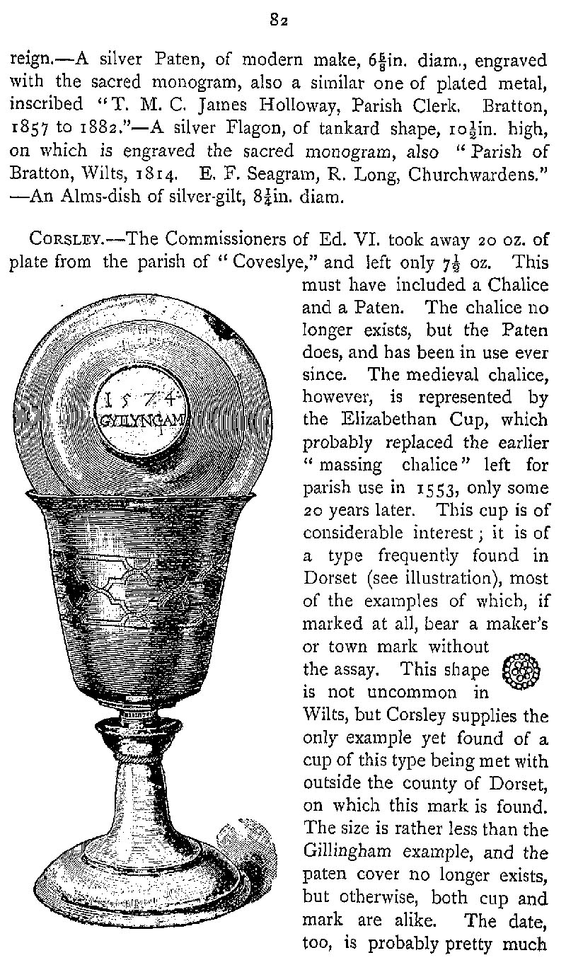 Page 115 Church plate in Bratton Church and Corsley Church,with a drawing of an Elizabethan cup and cover from Gillingham, Dorset.