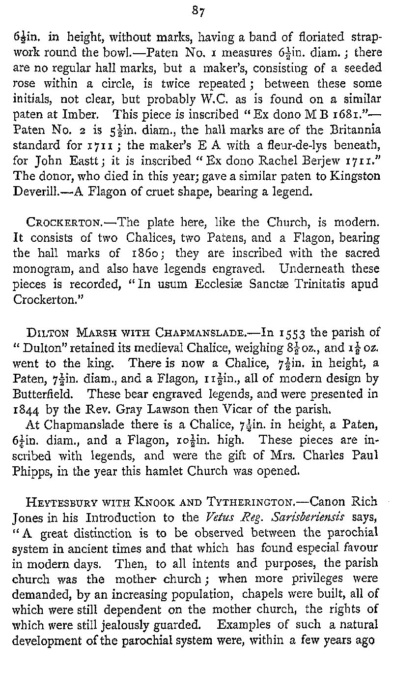 Page 121 Church Plate in Monkton Deverill Church, Crockerton Church, Dilton Marsh and Chapmanslade Churches, and Heytesbury Church.