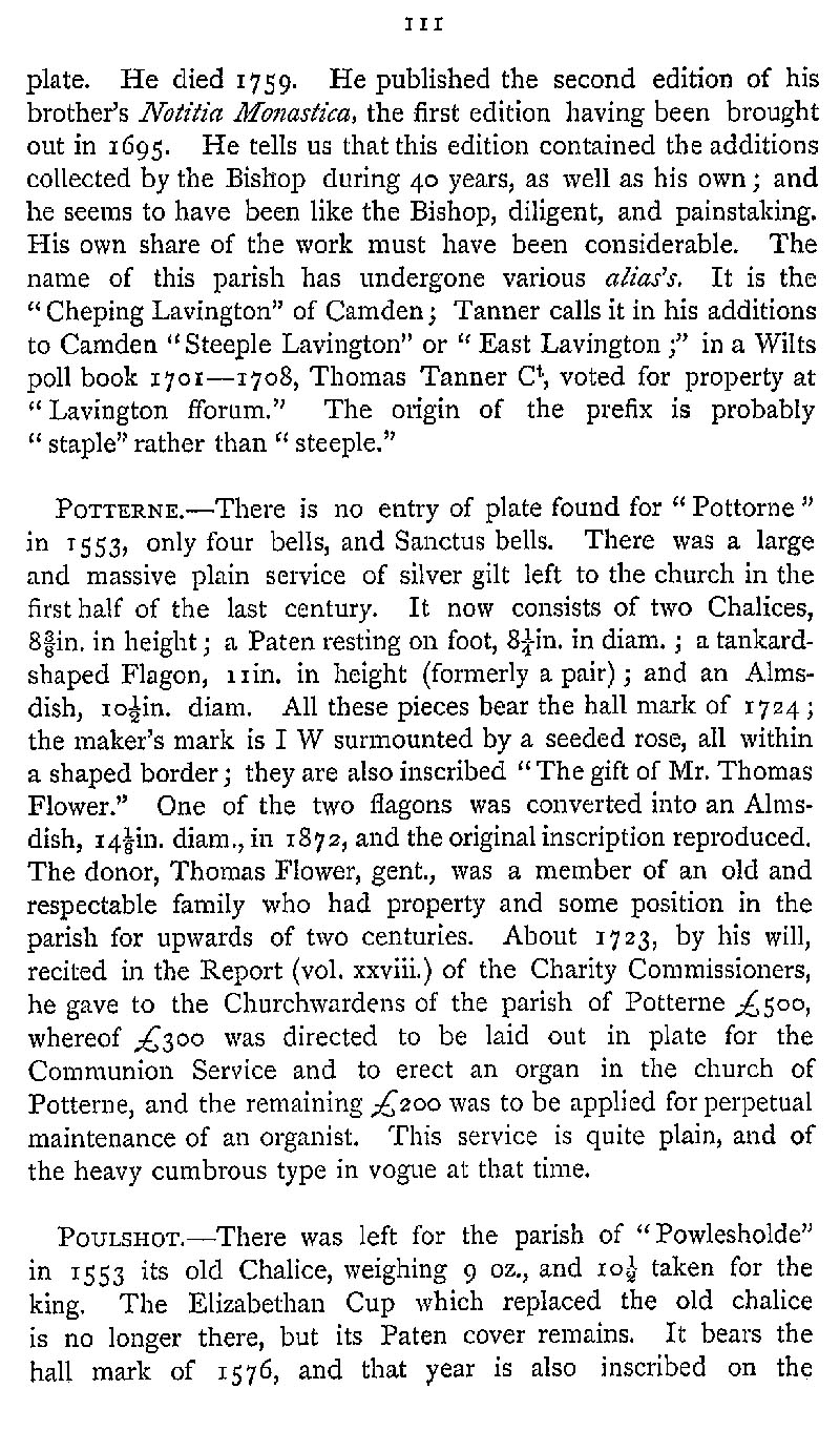 Page 145 Church Plate in Market Lavington Church, Potterne Church, and Poulshot Church.