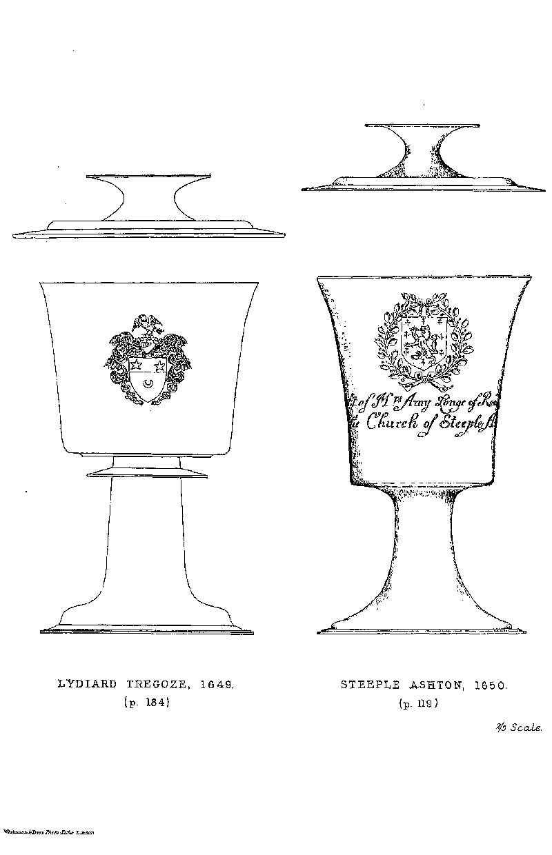 Page 156 Drawings of a chalice of 1649 in Lydiard Tregoze Church, and a chalice of 1650 in Steeple Ashton Church.