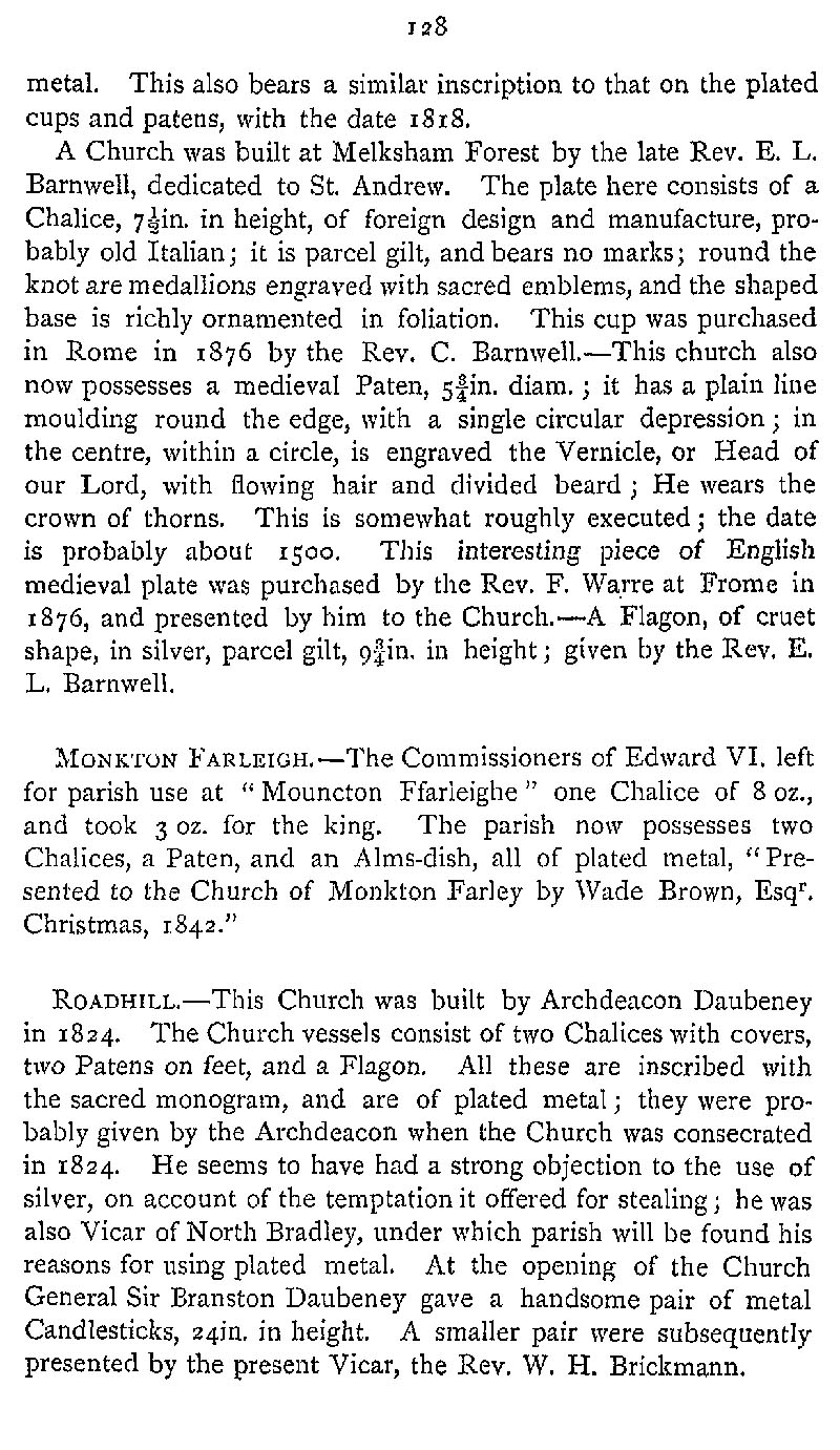Page 164 Church plate in Melksham Church, Monkton Farleigh Church, and Road Hill (was North Bradley and Southwick, now in Somerset) Church.