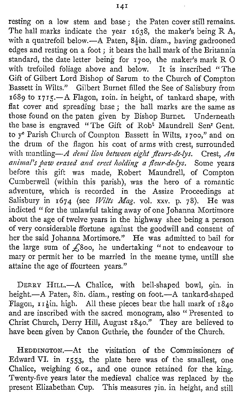 Page 177 Church plate in Compton Bassett Church, Derry Hill (Calne Without) Church, and Heddington Church.