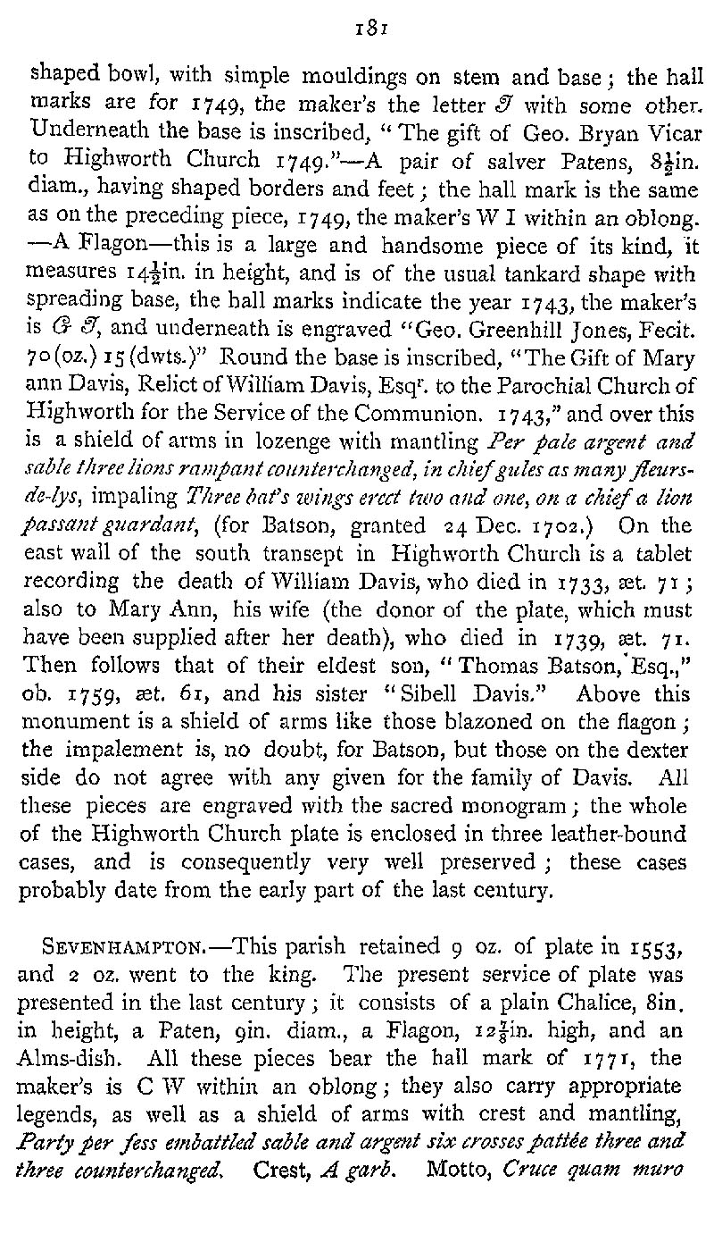 Page 224 Church plate in Highworth Church, and Sevenhampton Church.