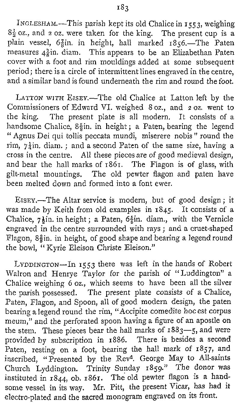 Page 227 Church plate in Inglesham Church, Latton Church, Eisey Church, and Liddington Church.