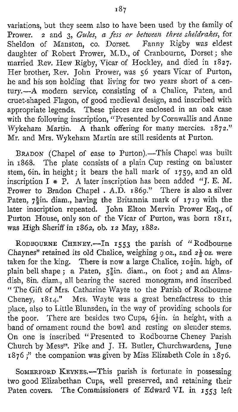 Page 231 Church plate in Purton Church, Braydon Church, Rodbourne Cheney Church, and Somerford Keynes Church (now in Gloucestershire).