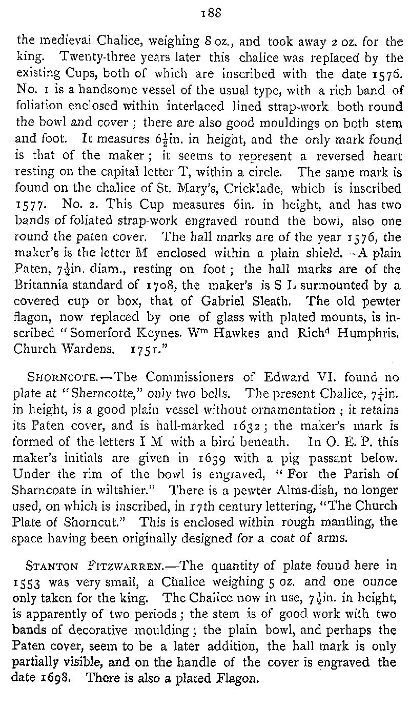 Page 232 Church plate in Somerford Keynes Church (now in Gloucestershire), Shorncote Church (now Gloucestershire), and Stanton Fitzwarren Church.