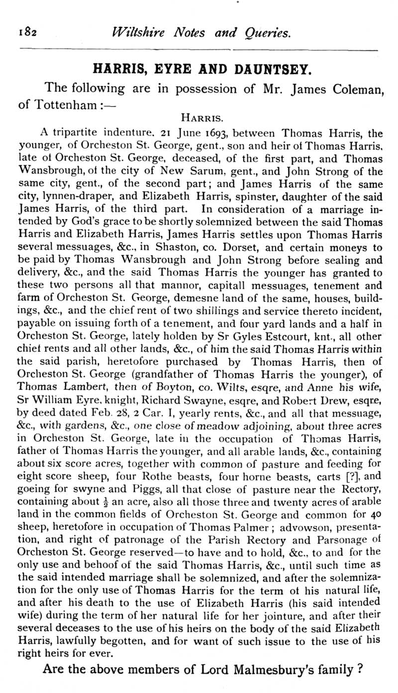 Chapter 5 Paul Bush, last rector of Edington, Bush Family; Feet of Fines for Wiltshire; Quakerism in Wiltshire; Horton Wills; Goddard of Sedgehill; Queries; Replies; Harris, Eyre and Dauntsey; Notes on Books; Review of The Genealogist Magazine.