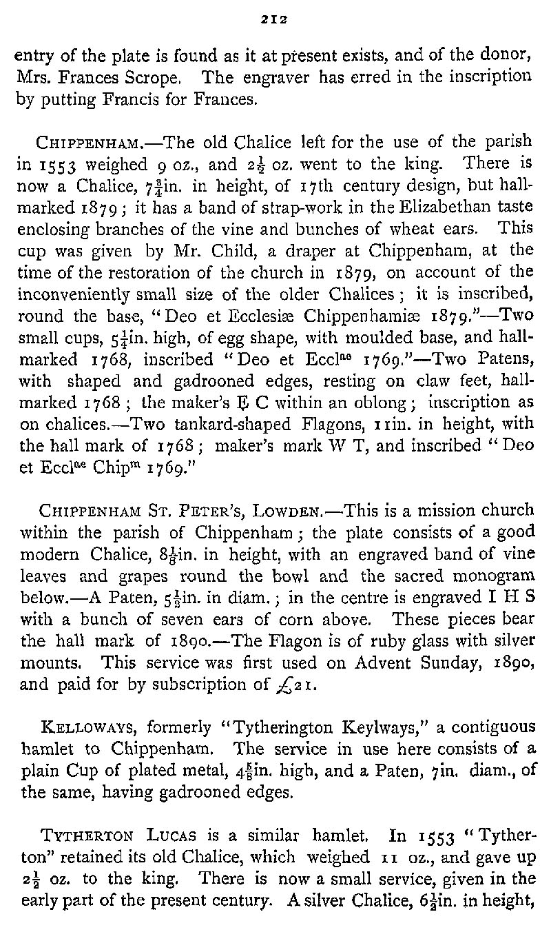 Page 257 Church plate in Castle Combe Church, St. Andrew's Church, Chippenham, St. Peter's Church, Chippenham, Kellaways Church (Langley Burrell), and Tytherton Lucas Church.