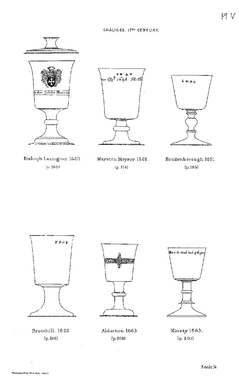 Page 5 Drawings of 17th century chalices from West Lavington, Marston Maisey, Brokenborough, Bremhill, Alderton and Minety.