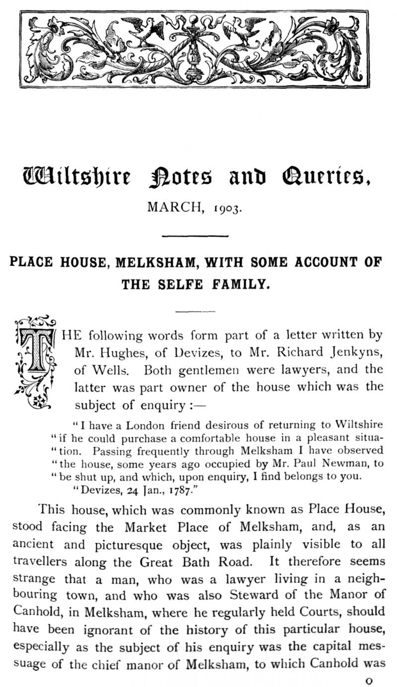 Chapter 6 Place House, Melksham; Records of Wiltshire Parishes; Quakerism in Wiltshire; Feet of Fines for Wiltshire; Bush Family; William Snow and Bradenstoek Priory; Geneaology; Melksham Common Rights; Cartularies of Wiltshire Abbeys and Monasteries; Queries; Repl