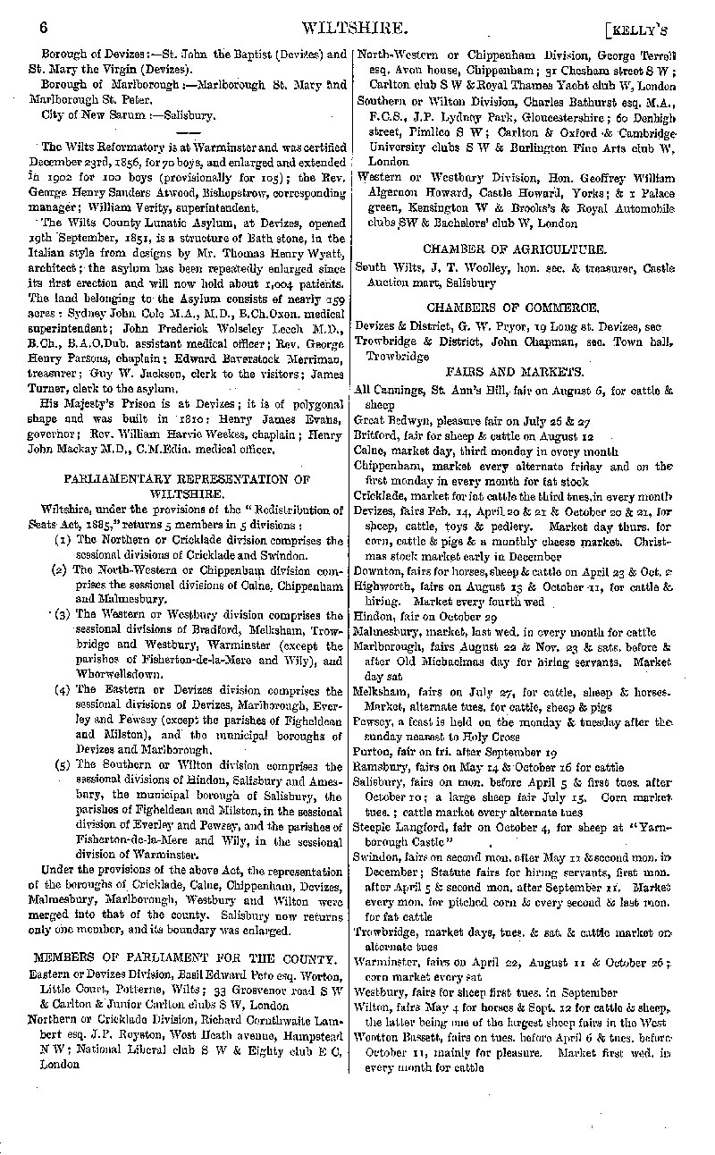 Page 23 Wiltshire; local administration, hundreds and their parishes, reformatory, county lunatic asylum, M.P.s, fairs and markets.