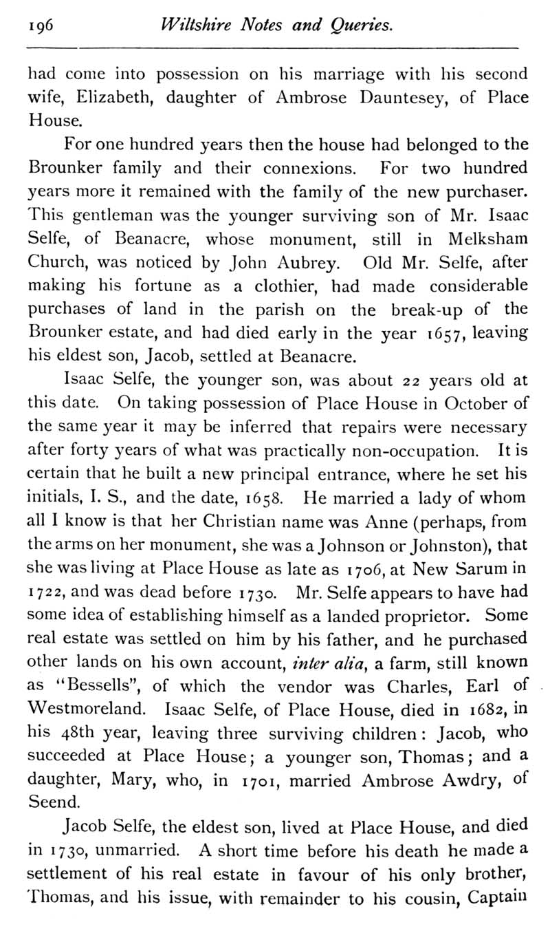 Chapter 6 Place House, Melksham; Records of Wiltshire Parishes; Quakerism in Wiltshire; Feet of Fines for Wiltshire; Bush Family; William Snow and Bradenstoek Priory; Geneaology; Melksham Common Rights; Cartularies of Wiltshire Abbeys and Monasteries; Queries; Repl
