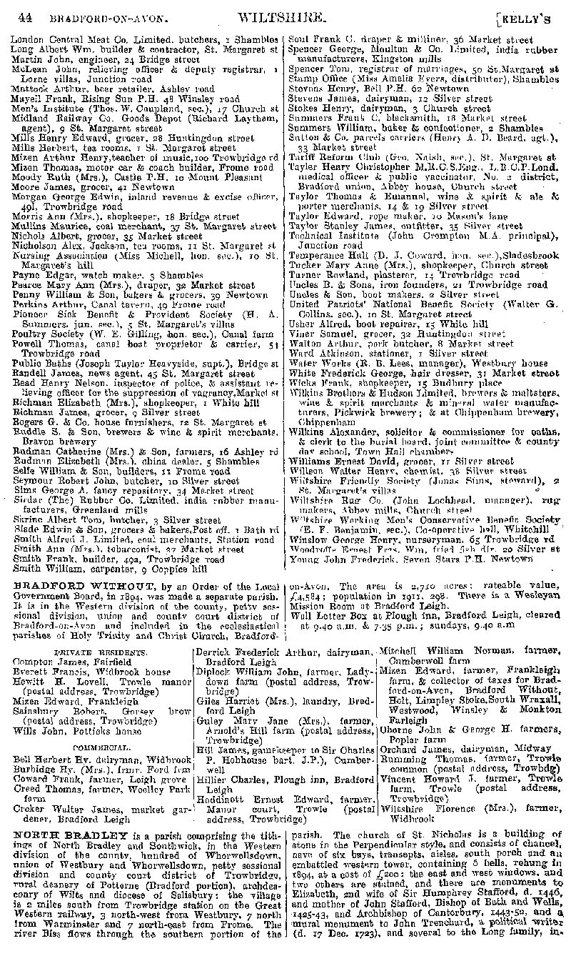 Page 24 Bradford on Avon; businesses from London Central Meat Co. to Young. Description and residents of Bradford Without, and North Bradley.