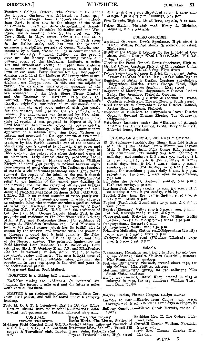 Page 61 Corsham; Church of St. Bartholomew, Corsham Court, public officers, churches and chapels, schools; private residents from Balch to Clark.