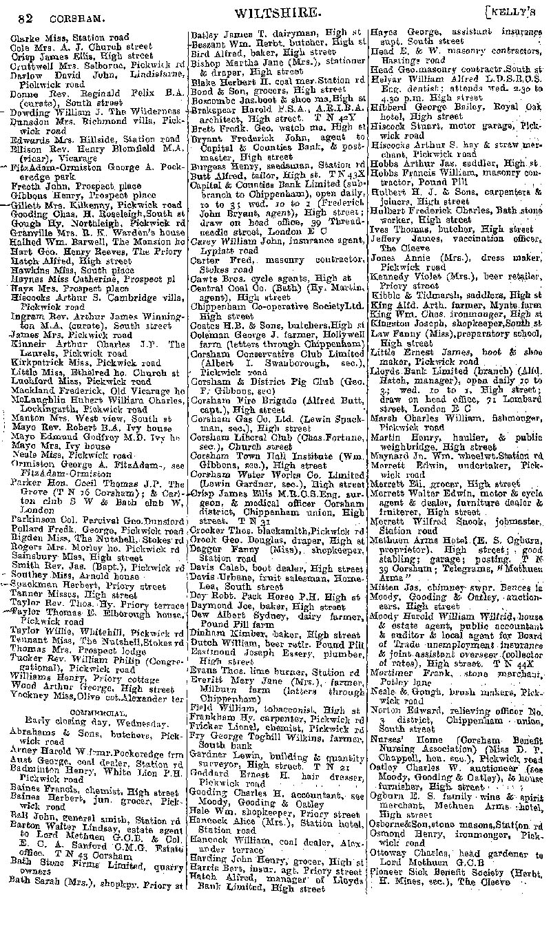 Page 62 Corsham; private residents from Clarke to Yockney, businesses from Abrahams to Pioneer Sick Benefit Society.