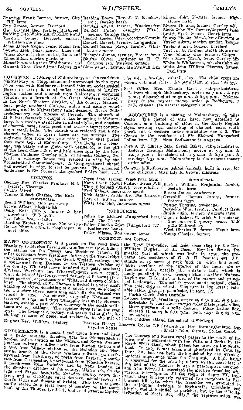Page 64 Description and residents of Corsley, Corston, East Coulston, and Cricklade.