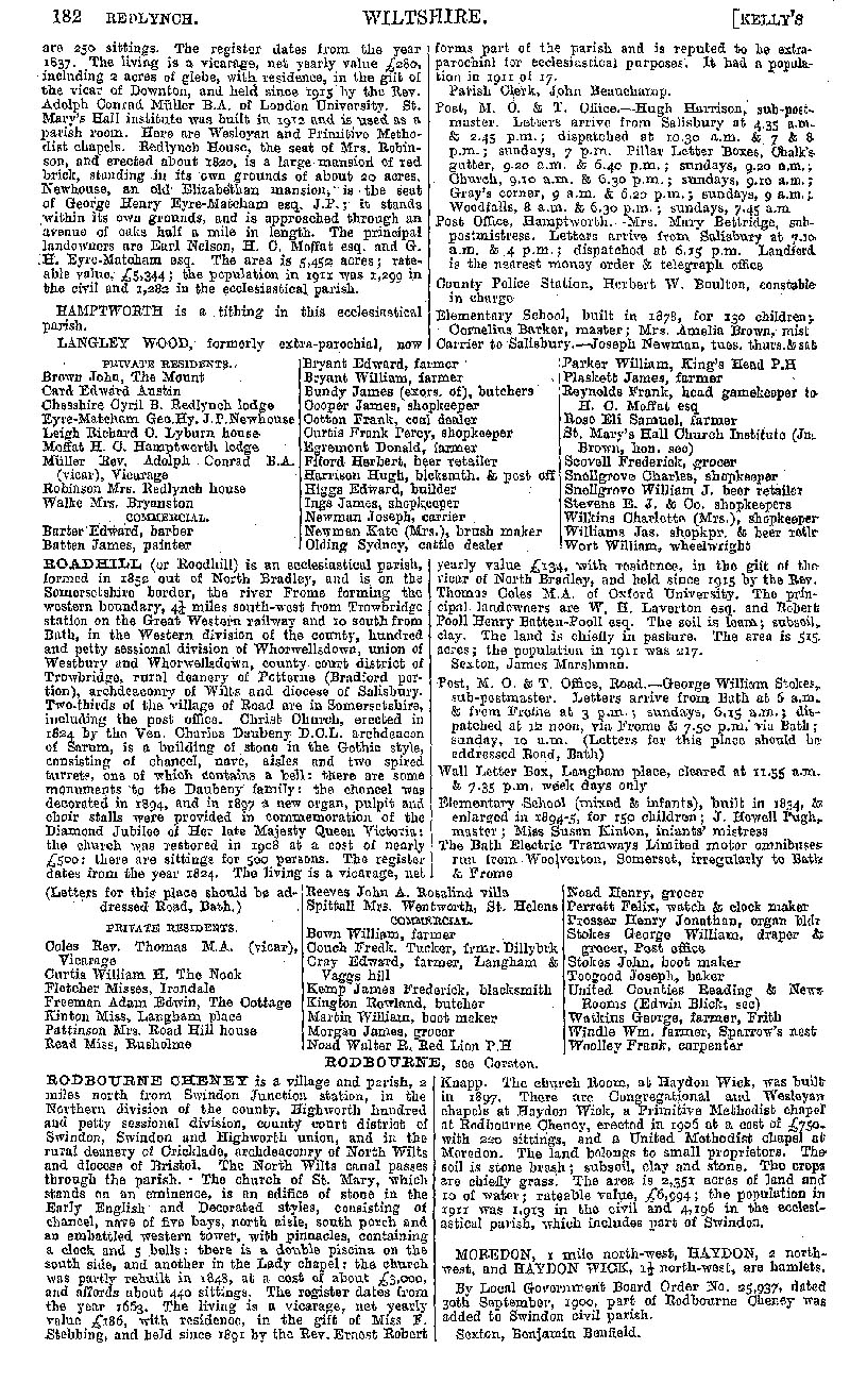 Page 162 Description and residents of Redlynch, Road (Rode) Hill (now in Somerset), and Rodbourne Cheney.