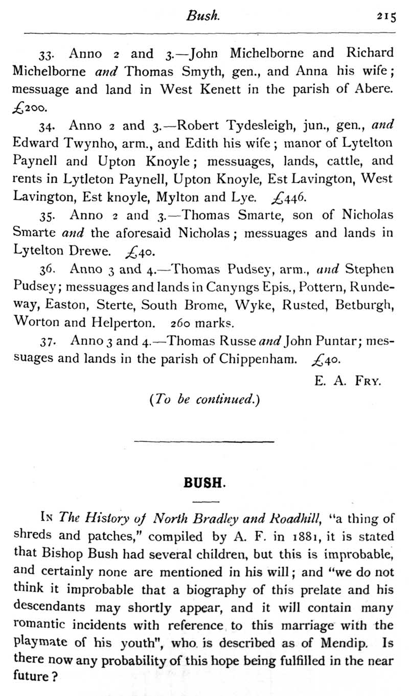 Chapter 6 Place House, Melksham; Records of Wiltshire Parishes; Quakerism in Wiltshire; Feet of Fines for Wiltshire; Bush Family; William Snow and Bradenstoek Priory; Geneaology; Melksham Common Rights; Cartularies of Wiltshire Abbeys and Monasteries; Queries; Repl