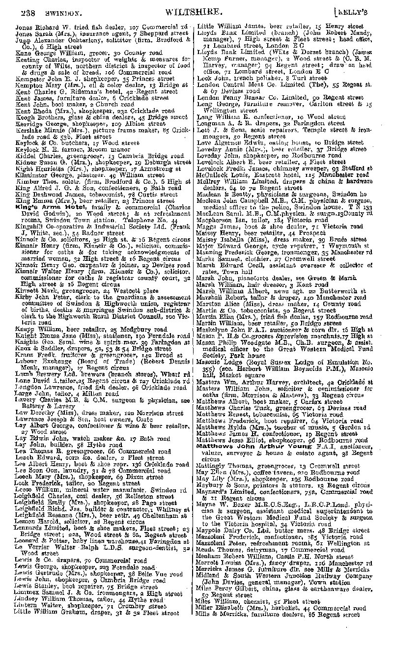 Page 218 Swindon; businesses from Jones to Mills and Meyricks.